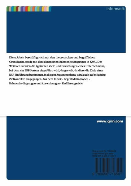Akademische Arbeit aus dem Jahr 2008 im Fachbereich Informatik - Wirtschaftsinformatik, Note: 1,7, Hamburger Fern-Hochschule, Sprache: Deutsch, Abstract: Diese Arbeit beschäftigt sich mit den theoretischen und begrifflichen Grundlagen, sowie mit den allgemeinen Rahmenbedingungen in KMU. Des Weiteren werden die typischen Ziele und Erwartungen eines Unternehmens, bei dem ein ERP-System eingeführt wird, dargestellt, da diese die Ziele einer ERP-Einführung bestimmen. In diesem Zusammenhang wird auch auf mögliche Zielkonflikte eingegangen.Aus dem Inhalt:- Begriffsdefinitionen- Rahmenbedingungen und Auswirkungen- Einführungsziele