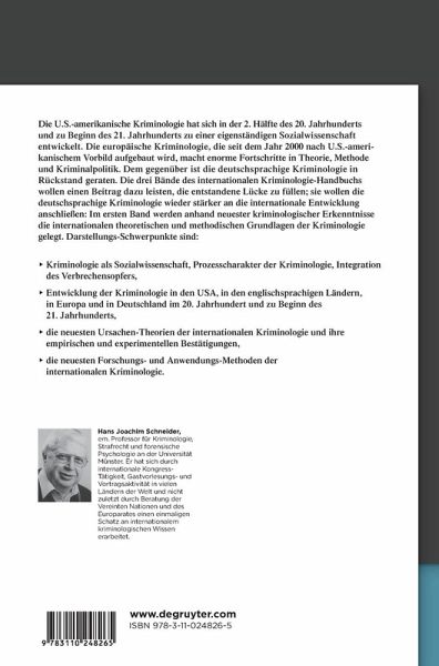Das dreibändige Werk behandelt die Kriminologie in acht Teilen und bietet umfassende, präzise und straffe Information. Das sozialwissenschaftliche Konzept der internationalen kriminologischen Hauptrichtung ist prägend für das Gesamtwerk. Band 1 befasst sich mit den Grundlagen der Kriminologie.