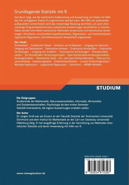 Dr. Jürgen Groß war als Dozent an der Fakultät Statistik der Technischen Universität Dortmund und dem Institut für Mathematik an der Carl von Ossietzky Universität Oldenburg tätig. Er hat langjährige Erfahrung in der Vermittlung von Methoden theoretischer Statistik und deren Anwendung mit Hilfe von R.
