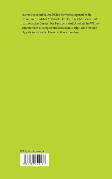 Erstmals 1951 publiziert, bilden die Vorlesungen über die Grundlagen und den Aufbau der Ethik ein geschlossenes und harmonisches Ganzes. Der Band geht zurück auf ein im Wintersemester 1876 niedergeschriebenes Manuskript, das Brentano 1894 als Kolleg an der Univ. Wien vortrug.