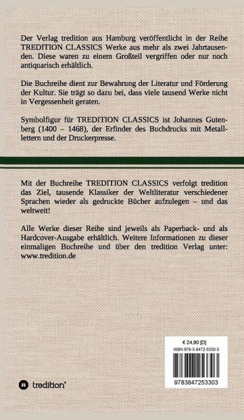 Diese Hardcover-Ausgabe ist Teil der TREDITION CLASSICS. Der Verlag tredition aus Hamburg veröffentlicht in der Buchreihe TREDITION CLASSICS Werke aus mehr als zwei Jahrtausenden. Diese waren zu einem Großteil vergriffen oder nur noch antiquarisch erhältlich. Mit TREDITION CLASSICS verfolgt tredition das Ziel, tausende Klassiker der Weltliteratur verschiedener Sprachen wieder als gedruckte Bücher zu verlegen und das weltweit! Die Buchreihe dient zur Bewahrung der Literatur und Förderung der Kultur. Sie trägt so dazu bei, dass viele tausend Werke nicht in Vergessenheit geraten.