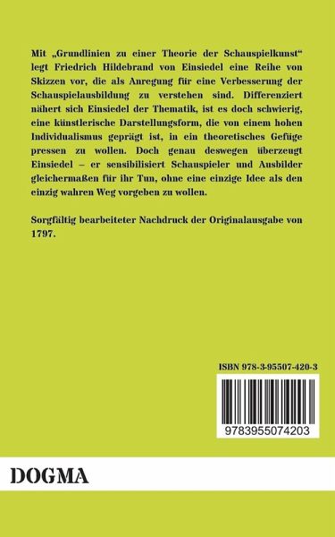 Mit Grundlinien zu einer Theorie der Schauspielkunst legt Friedrich Hildebrand von Einsiedel eine Reihe von Skizzen vor, die als Anregung für eine Verbesserung der Schauspielausbildung zu verstehen sind. Differenziert nähert sich Einsiedel der Thematik, ist es doch schwierig, eine künstlerische Darstellungsform, die von einem hohen Individualismus geprägt ist, in ein theoretisches Gefüge pressen zu wollen. Doch genau deswegen überzeugt Einsiedel er sensibilisiert Schauspieler und Ausbilder gleichermaßen für ihr Tun, ohne eine einzige Idee als den einzig wahren Weg vorgeben zu wollen.