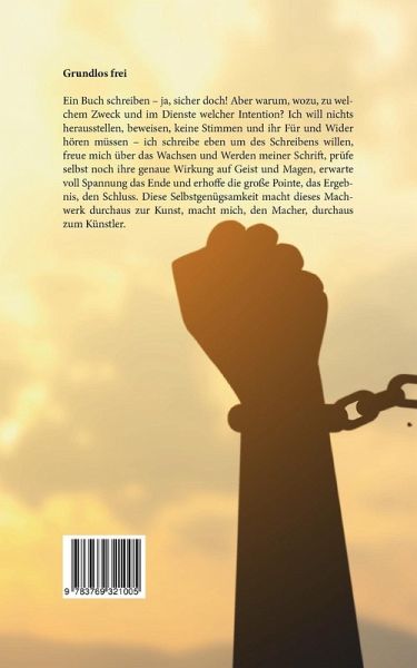 Ein Buch schreiben - ja, sicher doch! Aber warum, wozu, zu welchem Zweck und im Dienste welcher Intention? Ich will nichts herausstellen, beweisen, keine Stimmen und ihr Für und Wider hören müssen - ich schreibe eben um des Schreibens willen, freue mich über das Wachsen und Werden meiner Schrift, prüfe selbst noch ihre genaue Wirkung auf Geist und Magen, erwarte voll Spannung das Ende und erhoffe die große Pointe, das Ergebnis, den Schluss. Diese Selbstgenügsamkeit macht dieses Machwerk durchaus zur Kunst, macht mich, den Macher, durchaus zum Künstler.