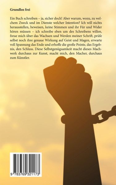 Ein Buch schreiben - ja, sicher doch! Aber warum, wozu, zu welchem Zweck und im Dienste welcher Intention? Ich will nichts herausstellen, beweisen, keine Stimmen und ihr Für und Wider hören müssen - ich schreibe eben um des Schreibens willen, freue mich über das Wachsen und Werden meiner Schrift, prüfe selbst noch ihre genaue Wirkung auf Geist und Magen, erwarte voll Spannung das Ende und erhoffe die große Pointe, das Ergebnis, den Schluss. Diese Selbstgenügsamkeit macht dieses Machwerk durchaus zur Kunst, macht mich, den Macher, durchaus zum Künstler.