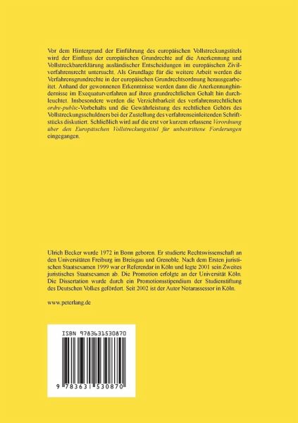 Vor dem Hintergrund der Einführung des europäischen Vollstreckungstitels wird der Einfluss der europäischen Grundrechte auf die Anerkennung und Vollstreckbarerklärung ausländischer Entscheidungen im europäischen Zivilverfahrensrecht untersucht. Als Grundlage für die weitere Arbeit werden die Verfahrensgrundrechte in der europäischen Grundrechtsordnung herausgearbeitet. Anhand der gewonnenen Erkenntnisse werden dann die Anerkennungshindernisse im Exequaturverfahren auf ihren grundrechtlichen Gehalt hin durchleuchtet. Insbesondere werden die Verzichtbarkeit des verfahrensrechtlichen ordre-public -Vorbehalts und die Gewährleistung des rechtlichen Gehörs des Vollstreckungsschuldners bei der Zustellung des verfahrenseinleitenden Schriftstücks diskutiert. Schließlich wird auf die erst vor kurzem erlassene Verordnung über den Europäischen Vollstreckungstitel für unbestrittene Forderungen eingegangen.