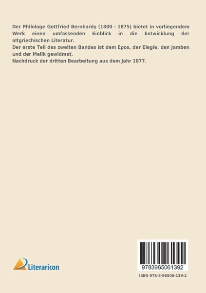 Der Philologe Gottfried Bernhardy (1800 - 1875) bietet in vorliegendem Werk einen umfassenden Einblick in die Entwicklung der altgriechischen Literatur.