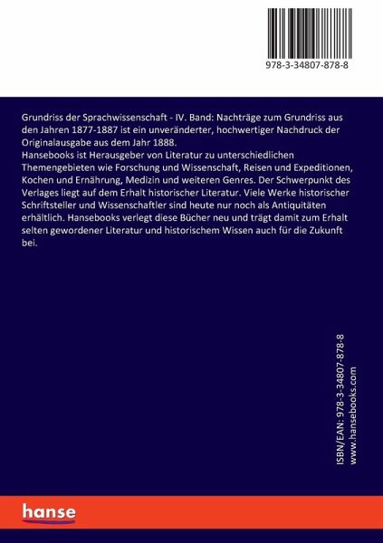 Grundriss der Sprachwissenschaft - IV. Band: Nachträge zum Grundriss aus den Jahren 1877-1887 ist ein unveränderter, hochwertiger Nachdruck der Originalausgabe aus dem Jahr 1888.Hansebooks ist Herausgeber von Literatur zu unterschiedlichen Themengebieten wie Forschung und Wissenschaft, Reisen und Expeditionen, Kochen und Ernährung, Medizin und weiteren Genres. Der Schwerpunkt des Verlages liegt auf dem Erhalt historischer Literatur. Viele Werke historischer Schriftsteller und Wissenschaftler sind heute nur noch als Antiquitäten erhältlich. Hansebooks verlegt diese Bücher neu und trägt damit zum Erhalt selten gewordener Literatur und historischem Wissen auch für die Zukunft bei.