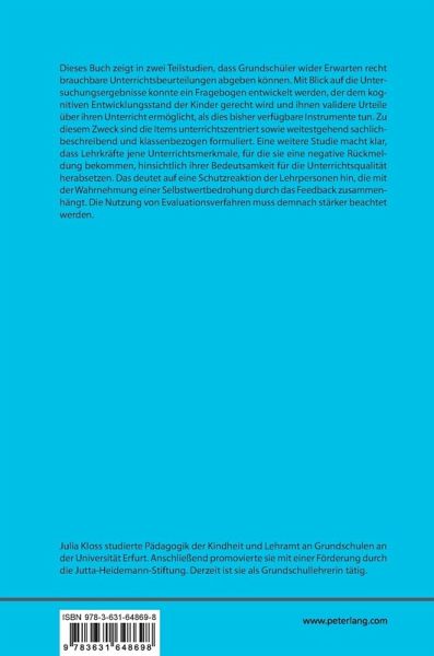 Dieses Buch zeigt in zwei Teilstudien, dass Grundschüler wider Erwarten recht brauchbare Unterrichtsbeurteilungen abgeben können. Mit Blick auf die Untersuchungsergebnisse konnte ein Fragebogen entwickelt werden, der dem kognitiven Entwicklungsstand der Kinder gerecht wird und ihnen validere Urteile über ihren Unterricht ermöglicht, als dies bisher verfügbare Instrumente tun. Zu diesem Zweck sind die Items unterrichtszentriert sowie weitestgehend sachlich-beschreibend und klassenbezogen formuliert. Eine weitere Studie macht klar, dass Lehrkräfte jene Unterrichtsmerkmale, für die sie eine negative Rückmeldung bekommen, hinsichtlich ihrer Bedeutsamkeit für die Unterrichtsqualität herabsetzen. Das deutet auf eine Schutzreaktion der Lehrpersonen hin, die mit der Wahrnehmung einer Selbstwertbedrohung durch das Feedback zusammenhängt. Die Nutzung von Evaluationsverfahren muss demnach stärker beachtet werden.