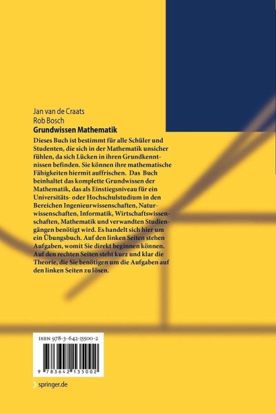 Dieses Buch ist bestimmt für alle Schüler und Studenten, die sich in der Mathematik unsicher fühlen, da sich Lücken in ihren Grundkenntnissen befinden. Sie können ihre mathematische Fähigkeiten hiermit auffrischen. Das Buch beinhaltet das komplette Grundwissen der Mathematik, das als Einstiegsniveau für ein Universitäts- oder Hochschulstudium in den Bereichen Ingenieurwissenschaften, Naturwissenschaften, Informatik, Wirtschaftswissenschaften, Mathematik und verwandten Studiengängen benötigt wird. Es handelt sich hier um ein Übungsbuch. Auf den linken Seiten stehen Aufgaben, womit Sie direkt beginnen können. Auf den rechten Seiten steht kurz und klar die Theorie, die Sie benötigen um die Aufgaben auf den linken Seiten zu lösen.