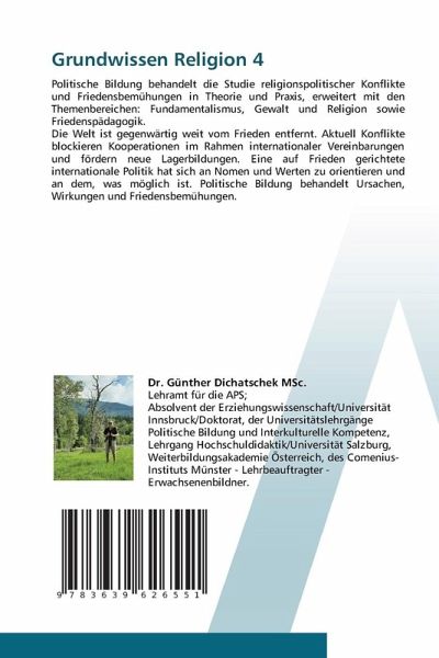 Politische Bildung behandelt die Studie religionspolitischer Konflikte und Friedensbemühungen in Theorie und Praxis, erweitert mit den Themenbereichen: Fundamentalismus, Gewalt und Religion sowie Friedenspädagogik. Die Welt ist gegenwärtig weit vom Frieden entfernt. Aktuell Konflikte blockieren Kooperationen im Rahmen internationaler Vereinbarungen und fördern neue Lagerbildungen. Eine auf Frieden gerichtete internationale Politik hat sich an Nomen und Werten zu orientieren und an dem, was möglich ist. Politische Bildung behandelt Ursachen, Wirkungen und Friedensbemühungen.