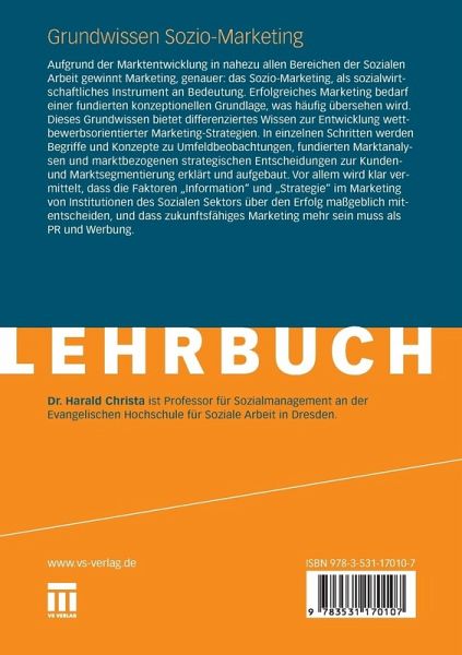 Aufgrund der Marktentwicklung in nahezu allen Bereichen der Sozialen Arbeit gewinnt Marketing, genauer: das Sozio-Marketing, als sozialwirtschaftliches Instrument an Bedeutung. Erfolgreiches Marketing bedarf einer fundierten konzeptionellen Grundlage, was häufig übersehen wird. Dieses Grundwissen bietet differenziertes Wissen zur Entwicklung wettbewerbsorientierter Marketing-Strategien. In einzelnen Schritten werden Begriffe und Konzepte zu Umfeldbeobachtungen, fundierten Marktanalysen und marktbezogenen strategischen Entscheidungen zur Kunden- und Marktsegmentierung erklärt und aufgebaut. Vor allem wird klar vermittelt, dass die Faktoren 'Information' und 'Strategie' im Marketing von Institutionen des Sozialen Sektors über den Erfolg maßgeblich mitentscheiden, und dass zukunftsfähiges Marketing mehr sein muss als PR und Werbung.