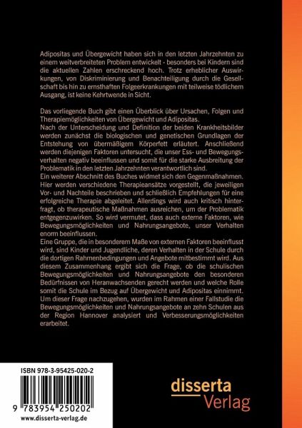 Das vorliegende Buch gibt einen Überblick über Ursachen, Folgen und Therapiemöglichkeiten von Übergewicht und Adipositas. Nach der Unterscheidung und Definition der beiden Krankheitsbilder werden zunächst die biologischen und genetischen Grundlagen der Entstehung von übermäßigem Körperfett erläutert. Anschließend werden diejenigen Faktoren untersucht, die unser Ess- und Bewegungsverhalten negativ beeinflussen und somit für die starke Ausbreitung der Problematik in den letzten Jahrzehnten verantwortlich sind.