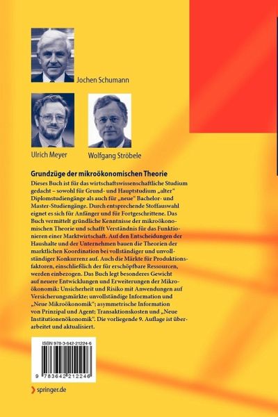Prof. em. Dr. Dr. h.c. Jochen Schumann ist ehemaliger Inhaber des Lehrstuhls für Volkswirtschaftstheorie der Westfälischen Wilhelms-Universität Münster. Seine Forschungsschwerpunkte sind Mikroökonomik, Außenwirtschaftstheorie, Input-Output-Analyse, Geschichte der Wirtschaftstheorie einschließlich Religionsökonomik. Er studierte Volkswirtschaftslehre an der Goethe-Universität Frankfurt/Main und wurde dort promoviert und habilitiert. 1960 ging er als Fellow der Rockefeller Foundation an die University of Pennsylvania, die Stanford University und die Harvard University. Er wurde langjähriges Mitglied des Council der International Input-Output Association und war Vorsitzende des Ausschusses für Außenwirtschaftstheorie und -politik der Gesellschaft für Wirtschafts- und Sozialwissenschaften (Verein für Socialpolitik). 1986 wurde er Ehrendoktor der Wroclaw University of Economics. Nach seiner Emeritierung hatte er Gastprofessuren in Kobe/Japan, Dresden und Innsbruck. Außer dem Lehrbuch "Grundzüge der mikroökonomischen Theorie" (9. Auflage Springer 2012) publizierte er u.a. die Monographie "Input-Output-Analyse" (Springer 1968) und die Aufsatzsammlung "Auf der Suche nach Klarheit im Kosmos der Ökonomie" (LIT 2009). Prof. Dr. Ulrich Meyer ist Professor Emeritus für Volkswirtschaftslehre, insbes. Mikroökonomie und Ordnungspolitik an der Universität Bamberg. Er studierte Mathematik und Volkswirtschaftslehre und promovierte und habilitierte an der Universität Münster. Vor der Übernahme des Lehrstuhles in Bamberg hatte er Lehrstuhlvertretungen an den Universitäten Osnabrück und Bamberg und eine Professor für Volkswirtschaftslehre an der Universität Mainz inne. Prof. Dr. Wolfgang Ströbele ist Professor für Volkswirtschaftslehre an der Westfälischen Wilhelms-Universität Münster mit den Forschungsschwerpunkten Wirtschaftstheorie, Energie- und Ressourcenökonomik und Klimapolitik.. Er studierte in Hannover, Göttingen undStockholm Mathematik und Volkswirtschaftslehre, promovierte und habilitierte an der Universität Hannover in Volkswirtschaftslehre. Direkt anschließend war er bis 1995 Professor in Oldenburg, bevor er den Lehrstuhl in Münster übernahm. Er hat - zum Teil als Koautor - 15 Bücher publiziert und rund 85 Zeitschriftenaufsätze, Forschungsberichte und Diskussionspapiere verfasst. Prof. Ströbele ist Experte für Energie-, Umwelt- und Ressourcenökonomik und Mitglied im Wissenschaftlichen Arbeitskreis für Regulierungsfragen bei der Bundesnetzagentur.