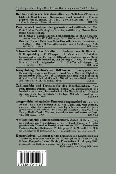 I. Einleitung.- A. Begriff des Schweißens.- B. Einteilung der Schweißverfahren.- C. Bedingungen für die Schweißbarkeit der Metalle.- II. Die Preßschweißverfahren.- A. Die Hammerschweißung.- B. Die elektrische Widerstandsschweißung.- III. Die Thermitschweißung.- IV. Die Schmelzschweißverfahren.- A. Die Gasschmelzschweißung.- B. Die Lichtbogenschweißung.- C. Die gas-elektrische Schweißung.- D. Das Schweißverfahren nach Weibel.- V. Entwurf, Berechnung und Ausführung geschweißter Bauteile.- A. Beurteilung der Schweißnähte.- B. Schrumpfungen und Schrumpfspannungen.- C. Allgemeine Berechnung von Schweißnähten.- D. Bezeichnung der Schweißnähte.- E. Anwendung der Schweißung im Stahlbau.- F. Die Schweißung im Kessel-, Behälter- und Rohrleitungsbau.- G. Anwendung der Schweißung im Maschinen- und Fahrzeugbau.- VI. Sondergebiete der Schweißtechnik.- A. Ausbesserungsschweißungen.- B. Dünnblechschweißung.- C. Auftragsschweißungen.- D. Die Schweißung von Stahlguß und Temperguß.- E. Die Gußeisenschweißung.- F. Die Schweißung von Nichteisenmetallen.- G. Das Schweißen von Kunststoffen.- VII. Die Prüfung der Schweißnähte.- A. Prüfungen ohne Zerstörung der Schweißnaht.- B. Prüfungen mit Zerstörung der Schweißnaht.- VIII. Kostenangaben für Schweißnähte.- Schweißtechnisches Schrifttum in Buchform.- IX. Sachverzeichnis.