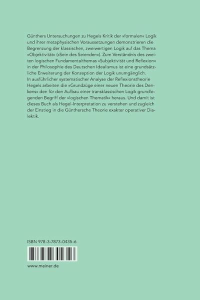 Günthers Untersuchungen zu Hegels Kritik der 'formalen' Logik und ihrer metaphysischen Voraussetzungen demonstrieren die Begrenzung der klassischen, zweiwertigen Logik auf das Thema 'Objektivität' ('Sein des Seienden'). Zum Verständnis des zweiten logischen Fundamentalthemas 'Subjektivität und Reflexion' in der Philosophie des Deutschen Idealismus ist eine grundsätzliche Erweiterung der Konzeption der Logik unumgänglich. In ausführlicher systematischer Analyse der Reflexionstheorie Hegels arbeiten die 'Grundzüge einer neuen Theorie des Denkens' den für den Aufbau einer transklassischen Logik grundlegenden Begriff der 'logischen Thematik' heraus. Und damit ist dieses Buch als Hegel-Interpretation zu verstehen und zugleich der Einstieg in die Günthersche Theorie exakter operativer Dialektik.