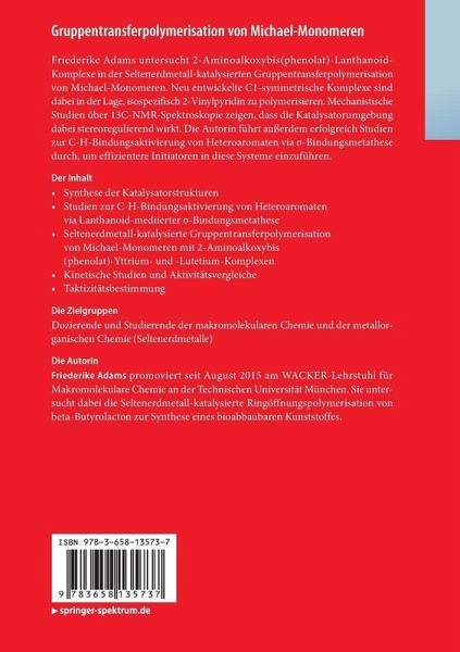 FriederikeAdams untersucht 2-Aminoalkoxybis(phenolat)-Lanthanoid-Komplexe in der Seltenerdmetall-katalysiertenGruppentransferpolymerisation von Michael-Monomeren. Neu entwickelteC1-symmetrische Komplexe sind dabei in der Lage, isospezifisch 2-Vinylpyridinzu polymerisieren. Mechanistische Studien über 13C-NMR-Spektroskopie zeigen, dassdie Katalysatorumgebung dabei stereoregulierend wirkt. Die Autorin führt außerdemerfolgreich Studien zur C-H-Bindungsaktivierung von Heteroaromaten vias-Bindungsmetathese durch, um effizientere Initiatoren in diese Systemeeinzuführen.