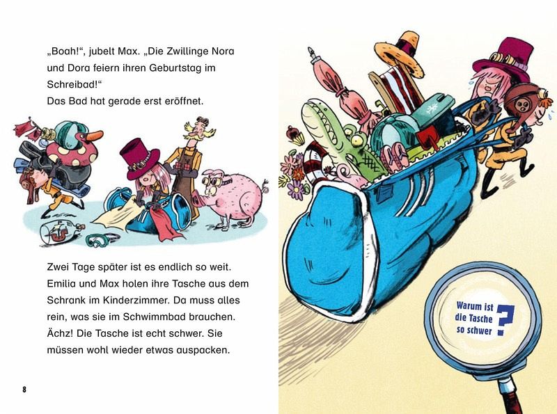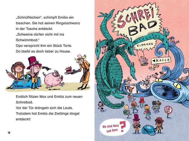 Ein neuer Auftrag ruft die Monsterjäger ins frisch eröffnete Schreibad. Dort feiern die Zwillinge Nora und Dora ihren Geburtstag. Doch zwischen riesigen Monsterrutschen und gruseligen Fratzen verstecken sich auch echte Monster. Die ärgern nicht nur die Badegäste, sondern auch den Monsterjäger-Club. So schnell wie möglich müssen Max, Emilia und Schnüffelschwein die Quälgeister vertreiben, sonst fällt die Party ins Wasser. Ob sie es rechtzeitig schaffen werden, die Monster zu stoppen?
