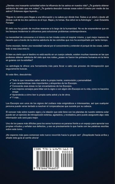 ¿Sientes una incesante curiosidad sobre la influencia de los astros en nuestra vida? ¿Te gustaría obtener sabiduría del cielo que nos rodea? ¿Te gustaría descubrir nuevas cosas sobre ti mismo por medio de los astros? Entonces sigue leyendo... "Sigues tu camino pero llegas a una bifurcación y no sabes por dónde tirar. Subes a un árbol y desde allí divisas cuál de los dos caminos es el tuyo. Bajas y lo tomas. Ese árbol es la Astrología." - Juan Estadella Ferrater El cielo nos ha guiado de muchas maneras a lo largo de la humanidad. No es de sorprenderse que en los tiempos modernos lo utilicemos para solucionar problemas contemporáneos. La necesidad de conocerse a sí mismo es tan innata como el respirar mismo, y qué mejor manera de hacerlo que a través de la eterna sabiduría de las estrellas que nos ha acompañado por tanto tiempo. Como escorpio, tienes una necesidad natural por el conocimiento y entender el porqué de las cosas, sobre todo si esa cosa eres tú. Si bien es cierto que el destino no está escrito en un cuerpo celeste, existen muchas maneras en las que podemos obtener sabiduría del cielo que nos rodea ¿acaso no fueron los primeros humanos en la tierra en guiarse con la estrellas? La astrología te ofrece una herramienta más para llevar a cabo ese proceso de introspección que seguramente buscas. En este libro, descubrirás: Todo lo que necesitas saber sobre tu propia mente, cosmovisión y personalidad. Las características más importantes y atrayentes de los Escorpio. Conocerás esas áreas no tan encantadoras de los Escorpio. Los mejores consejos para lidiar con tu signo o con algún otro Escorpio en tu vida, como no hacerlos enojar. Y más... Uno de los pasos más difíciles para los seres humanos es pararse frente a un espejo para apreciar sus propias virtudes y señalar sus defectos, y eso es precisamente lo que harás con las palabras escritas sobre este tomo. ¡No esperes más para comenzar este nuevo recorrido hacia tu propio ser! ¡Desplázate hacia arriba y añade esta guía al carrito ahora!