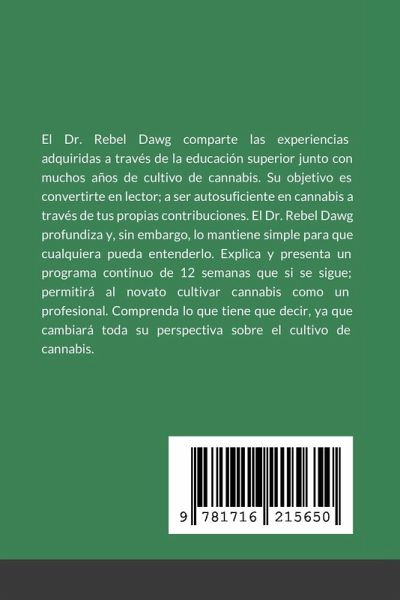 El Dr. Rebel Dawg cultivó su primera planta de cannabis en 1970 y comparte su gran experiencia y conocimiento con nosotros. Presenta el cultivo de cannabis de una manera tan agradable que incluso los totalmente inexpertos pueden tomar su información y cultivar cannabis húmedo como resultado. Su objetivo es transformar a cada lector en un cultivador autosuficiente en todas sus necesidades de cannabis a través de sus propias contribuciones. El Dr. Dawg cubre hidroponía, aeroponía, suelo orgánico, suelo vivo, clonación, clones, balance de PH, nutrientes, la diferencia entre cultivo orgánico y no orgánico, diagnóstico de plantas. Él presenta un programa que, si se sigue, le dará al lector la oportunidad de construir un jardín de cosecha perpetua que produzca una planta para cosechar todas las semanas del año.
