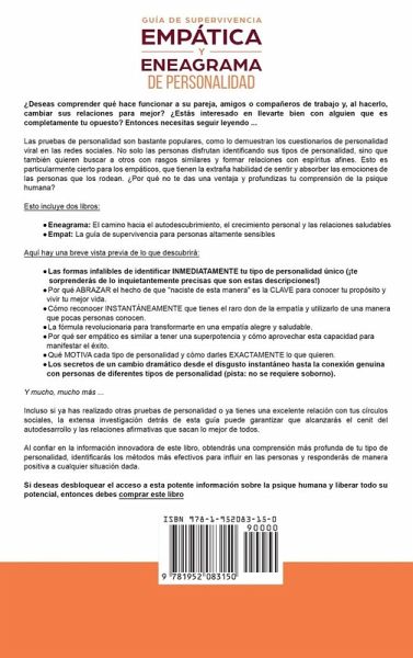 ¿Deseas comprender qué hace funcionar a su pareja, amigos o compañeros de trabajo y, al hacerlo, cambiar sus relaciones para mejor? ¿Estás interesado en llevarte bien con alguien que es completamente tu opuesto? Entonces necesitas seguir leyendo ... Las pruebas de personalidad son bastante populares, como lo demuestran los cuestionarios de personalidad viral en las redes sociales. No solo las personas disfrutan identificando sus tipos de personalidad, sino que también quieren buscar a otros con rasgos similares y formar relaciones con espíritus afines. Esto es particularmente cierto para los empáticos, que tienen la extraña habilidad de sentir y absorber las emociones de las personas que los rodean. ¿Por qué no te das una ventaja y profundizas tu comprensión de la psique humana? Esto incluye dos libros: Eneagrama: El camino hacia el autodescubrimiento, el crecimiento personal y las relaciones saludables Empat: La guía de supervivencia para personas altamente sensibles Aquí hay una breve vista previa de lo que descubrirá: Las formas infalibles de identificar INMEDIATAMENTE tu tipo de personalidad único (¡te sorprenderás de lo inquietantemente precisas que son estas descripciones!) Por qué ABRAZAR el hecho de que "naciste de esta manera" es la CLAVE para conocer tu propósito y vivir tu mejor vida. Cómo reconocer INSTANTÁNEAMENTE que tienes el raro don de la empatía y utilizarlo de una manera que pocas personas conocen. La fórmula revolucionaria para transformarte en una empatía alegre y saludable. Por qué ser empático es similar a tener una superpotencia y cómo aprovechar esta capacidad para manifestar el éxito. Qué MOTIVA cada tipo de personalidad y cómo darles EXACTAMENTE lo que quieren. Los secretos de un cambio dramático desde el disgusto instantáneo hasta la conexión genuina con personas de diferentes tipos de personalidad (pista: no se requiere soborno). Y mucho, mucho más ... Incluso si ya has realizado otras pruebas de personalidad o ya tienes una excelente relación con tus círculos sociales, la extensa investigación detrás de esta guía puede garantizar que alcanzarás el cenit del autodesarrollo y las relaciones afirmativas que sacan lo mejor de todos. Al confiar en la información innovadora de este libro, obtendrás una comprensión más profunda de tu tipo de personalidad, identificarás los métodos más efectivos para influir en las personas y responderás de manera positiva a cualquier situación dada. Si deseas desbloquear el acceso a esta potente información sobre la psique humana y liberar todo su potencial, entonces debes comprar este libro