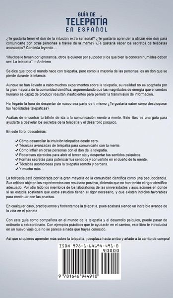 ¿Te gustaría tener el don de la intuición extra sensorial? ¿Te gustaría aprender a utilizar ese don para comunicarte con otras personas a través de la mente? ¿Te gustaría saber los secretos de telépatas avanzados? Continúa leyendo... "Muchos le temen por ignorancia, otros la quieren por su poder y los que bien la conocen humildes deben ser: La telepatía". - Anónimo Se dice que todo el mundo nace con telepatía, pero como la mayoría de las personas, es un don que se pierde durante la infancia. Aunque se han llevado a cabo muchos experimentos sobre la telepatía, su realidad no es aceptada por la gran mayoría de la comunidad científica, argumentando que las magnitudes de energía que el cerebro humano es capaz de producir resultan insuficientes para permitir la transmisión de información. Ha llegado la hora de despertar de nuevo esa parte de ti mismo ¿Te gustaría saber cómo desbloquear tus habilidades telepáticas? Acabas de encontrar tu billete de ida a la comunicación mente a mente. Este libro es una guía para ayudarte a desvelar los secretos de la telepatía y el desarrollo psíquico. En este libro, descubrirás: Cómo desarrollar la intuición telepática desde cero. Técnicas avanzadas de telepatía para comunicarte con tu mente. Cómo influir en otras personas con el don de la telepatía. Poderosos ejercicios para abrir el tercer ojo y despertar tus sentidos psíquicos. Formas secretas para potenciar tus sentidos y convertirte en el dueño de tu mente. Técnicas asombrosas para la telepatía remota y cercana. Y mucho más... ¿ En cualquier caso, practiquemos y fomentemos la telepatía, pues acabará siendo un increíble avance de la vida en el planeta. Con esta guía como compañera en el mundo de la telepatía y el desarrollo psíquico, puede pasar de ordinario a extraordinario. Con ejemplos prácticos que te ayudarán en el camino, este libro te introducirá en un nuevo viaje que no se parece a nada que hayas conocido. Así que si quieres aprender más sobre la telepatía, ¡desplaza hacia arriba y añade a tu carrito de compra!