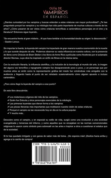 ¿Sientes curiosidad por los vampiros y buscas entender a estas criaturas con mayor profundidad? ¿Te has preguntado porqué los vampiros y su mitología han sido parte importante de muchas culturas a través de los años? ¿Cómo pasaron de ser vistos cómo criaturas terroríficas a carismáticos personajes en el cine y la literatura? Entonces sigue leyendo.. "Se encuentra frente al gran misterio... Al que hace temblar a la humanidad desde su origen: lo desconocido." - Gastón Leroux. Sin importar la fuente, la leyenda del vampiro ha impactado de gran manera nuestra cosmovisión de la muerte y lo que sucede después de ella. Podemos observar su vasta influencia en nuestra cultura, con la presencia de libros como Drácula de Bram Stoker o los libros de Anne Rice a películas como Nosferatu por el aclamado director Murnau, cuya obra ha inspirado un sinfín de filmes en la misma rama. Con la evolución literaria, la influencia científica, y la inclusión de la tecnología al mundo del arte, la imagen del alguna vez terrorífico y repugnante vampiro fue desapareciendo poco a poco, y un personaje que por muchos años se sintió como la representación gráfica del miedo fue volviéndose más amigable con la audiencia y llegando hasta el punto de ser retratado ocasionalmente cómo alguien apuesto e incluso carismático. ¿Pero cómo llegó la leyenda del vampiro a ese punto? En este libro descubrirás: -Los misteriosos orígenes del mito de los vampiros. -Quién fue Drácula y otros personajes esenciales de la mitología. -Las primeras leyendas que dieron forma a los vampiros -Las piezas literarias más importantes que moldearon nuestra visión de estas criaturas. -Porqué el vampiro es tan reconocido hoy en día en la cultura popular. -Y mucho más.. Descubre como el vampiro, y en especial su estilo de vida, surgió como una revolución a una sociedad evangelizada y temerosa del infierno, y como aquellos que no encajaban en las normas convencionales religiosas lo usaron como símbolo para sobresalir en las artes e inspirar a otros a cuestionar el estatus quo de la sociedad. Si te has quedado intrigado y con ganas de saber más del tema.. ¡No esperes más! ¡Desliza hacia arriba y agrega a tu carrito de compra!