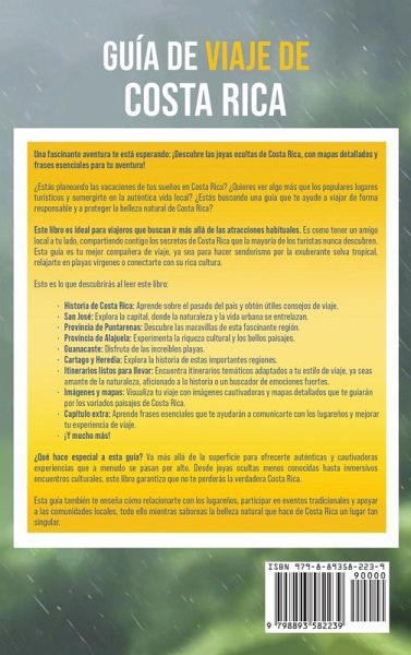 Una fascinante aventura te está esperando: ¡Descubre las joyas ocultas de Costa Rica, con mapas detallados y frases esenciales para tu aventura! ¿Estás planeando las vacaciones de tus sueños en Costa Rica? ¿Quieres ver algo más que los populares lugares turísticos y sumergirte en la auténtica vida local? ¿Estás buscando una guía que te ayude a viajar de forma responsable y a proteger la belleza natural de Costa Rica? Este libro es ideal para viajeros que buscan ir más allá de las atracciones habituales. Es como tener un amigo local a tu lado, compartiendo contigo los secretos de Costa Rica que la mayoría de los turistas nunca descubren. Esta guía es tu mejor compañera de viaje, ya sea para hacer senderismo por la exuberante selva tropical, relajarte en playas vírgenes o conectarte con su rica cultura. Esto es lo que descubrirás al leer este libro: Historia de Costa Rica: Aprende sobre el pasado del país y obtén útiles consejos de viaje. San José: Explora la capital, donde la naturaleza y la vida urbana se entrelazan. Provincia de Puntarenas: Descubre las maravillas de esta fascinante región. Provincia de Alajuela: Experimenta la riqueza cultural y los bellos paisajes. Guanacaste: Disfruta de las increíbles playas. Cartago y Heredia: Explora la historia de estas importantes regiones. Itinerarios listos para llevar: Encuentra itinerarios temáticos adaptados a tu estilo de viaje, ya seas amante de la naturaleza, aficionado a la historia o un buscador de emociones fuertes. Imágenes y mapas: Visualiza tu viaje con imágenes cautivadoras y mapas detallados que te guiarán por los variados paisajes de Costa Rica. Capítulo extra: Aprende frases esenciales que te ayudarán a comunicarte con los lugareños y mejorar tu experiencia de viaje. ¡Y mucho más! ¿Qué hace especial a esta guía? Va más allá de la superficie para ofrecerte auténticas y cautivadoras experiencias que a menudo se pasan por alto. Desde joyas ocultas menos conocidas hasta inmersivos encuentros culturales, este libro garantiza que no te perderás la verdadera Costa Rica. Esta guía también te enseña cómo relacionarte con los lugareños, participar en eventos tradicionales y apoyar a las comunidades locales, todo ello mientras saboreas la belleza natural que hace de Costa Rica un lugar tan singular.