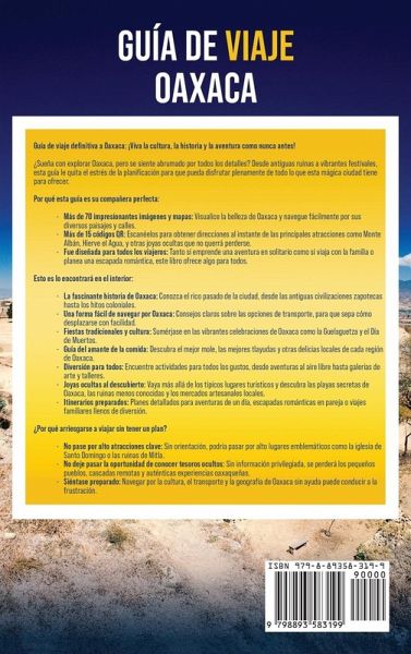 Guía de viaje definitiva a Oaxaca: ¡Viva la cultura, la historia y la aventura como nunca antes!¿Sueña con explorar Oaxaca, pero se siente abrumado por todos los detalles? Desde antiguas ruinas a vibrantes festivales, esta guía le quita el estrés de la planificación para que pueda disfrutar plenamente de todo lo que esta mágica ciudad tiene para ofrecer.Por qué esta guía es su compañera perfecta:Más de 70 impresionantes imágenes y mapas: Visualice la belleza de Oaxaca y navegue fácilmente por sus diversos paisajes y calles. Más de 15 códigos QR: Escanéelos para obtener direcciones al instante de las principales atracciones como Monte Albán, Hierve el Agua, y otras joyas ocultas que no querrá perderse. Fue diseñada para todos los viajeros: Tanto si emprende una aventura en solitario como si viaja con la familia o planea una escapada romántica, este libro ofrece algo para todos. Esto es lo encontrará en el interior:La fascinante historia de Oaxaca: Conozca el rico pasado de la ciudad, desde las antiguas civilizaciones zapotecas hasta los hitos coloniales. Una forma fácil de navegar por Oaxaca: Consejos claros sobre las opciones de transporte, para que sepa cómo desplazarse con facilidad. Fiestas tradicionales y cultura: Sumérjase en las vibrantes celebraciones de Oaxaca como la Guelaguetza y el Día de Muertos. Guía del amante de la comida: Descubra el mejor mole, las mejores tlayudas y otras delicias locales de cada región de Oaxaca. Diversión para todos: Encuentre actividades para todos los gustos, desde aventuras al aire libre hasta galerías de arte y talleres. Joyas ocultas al descubierto: Vaya más allá de los típicos lugares turísticos y descubra las playas secretas de Oaxaca, las ruinas menos conocidas y los mercados artesanales locales. Itinerarios preparados: Planes detallados para aventuras de un día, escapadas románticas en pareja o viajes familiares llenos de diversión.