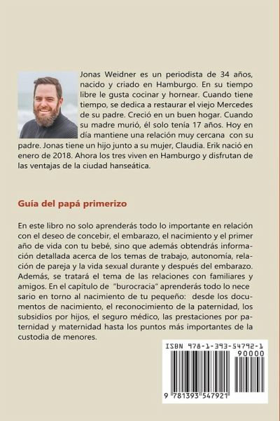 Cómo convertirte rápidamente en un popular experto en cuestiones relacionadas con los hijos ¿Quieres saber todo lo relacionado con el deseo de concebir, el embarazo y el bebé? ¿Como padre de tus hijos, te gustaría compaginar tu familia con tu trabajo y carrera, ya trabajes como empleado en una empresa o por cuenta propia? ¿Y te gustaría, pese a tener un hijo, saber cómo tener la actitud adecuada para mantener una relación intacta y tener una vida sexual plena? ¿O simplemente buscas el regalo apropiado? En mi libro podrás vercómo vencer el miedo a ser padre cómo no debes renunciar al sexo antes y después del nacimiento cómo te das cuenta de que tu pareja está embarazada qué es lo que debes hacer y lo que no debes hacer durante el embarazo qué es lo que cambia en la relación y a qué debes prestar atención cómo puedes mantenerte en forma con el bebé las diferentes posibilidades que existen para el parto cómo puedes hacer de tu casa un hogar seguro cómo construyes una relación cercana con tu bebé cómo ves el mundo desde tu punto de vista cómo te manejas con tu entorno en caso de que haya discrepancias cómo solucionas la jungla burocrática de la manera más rápida posible ... ¿Buscas una respuesta a estas y otras muchas preguntas? ¡Entonces la guía del papá primerizo es exactamente el libro correcto para ti! Aprenderás todo lo que necesitas saber acerca del deseo de concebir, el embarazo, el parto y el bebé. Es la inmersión perfecta en el tema y te acompañará hasta el final del primer año de vida de tu bebé. Después podrás utilizar el libro como obra de consulta. ¿Quieres que un libro te cuente sin rodeos los hechos más importantes acerca del tema de "ser padre"? ¿Quieres un libro con mucha información adicional, consejos y listas de comprobación? ¿Un libro con más de 26.000 palabras? La traductora no solo ha traducido el libro de forma concienzuda al español, sino que también ha adaptado el contenido a la situación española, en concreto el último capítulo, que se ocupa de los obstáculos burocráticos. ¡Entonces deja de buscar y pulsa el botón de "COMPRAR AHORA"!