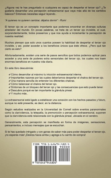 ¿Alguna vez te has preguntado si cualquiera es capaz de despertar el tercer ojo? ¿Te gustaría desarrollar una percepción extrasensorial que vaya más allá de los sentidos básicos? Entonces necesitas seguir leyendo.. "A quienes no quieren cambiar, déjalos dormir" - Rumi El tercer ojo es un concepto importante que podemos encontrar en diversas culturas alrededor del mundo. En pocas palabras, se trata de un tercer ojo invisible, el cual, sorprendentemente, todos poseemos y que nos ayuda a incrementar la percepción de nuestra realidad. Muchos piensan que solo unos cuantos poseen la habilidad de despertar el tercer ojo invisible, y así, poder acceder a los beneficios únicos que éste ofrece. ¿Pero qué tan cierto es esto? Afortunadamente, existen una serie de pasos sencillos que todos podemos aplicar para acceder a una serie de poderes extra sensoriales del tercer ojo, los cuales nos traen enormes beneficios en nuestra vida diaria. En este libro descubrirás: -Cómo desarrollar al máximo tu intuición extrasensorial interna. -Importantes razones por las cuales deberíamos despertar el chakra del tercer ojo. -Una manera sencilla de entender los diferentes chakras. -Cómo balancear el chakra del tercer ojo. -Síntomas de un bloqueo del tercer ojo y las consecuencias que esto puede tener. -Descubre porqué es tan importante la glándula pineal. -Y mucho más.. Lo extrasensorial está ligado a establecer una conexión con los hechos pasados y futuro, aunque no esté presente, es decir, en la distancia. Según estudios realizados en la Universidad de Cornell sobre eventos paranormales como la clarividencia, la telepatía, la premonición o percepción extrasensorial, suponen que la clarividencia está relacionada con la glándula pineal, ubicada en el cerebro. Generalmente, esta percepción se manifiesta en forma de imágenes, sensaciones, pensamientos, e incluso mensajes que se escuchan. Si te has quedado intrigado y con ganas de saber más para poder despertar el tercer ojo, ¡no esperes más! ¡Desliza hacia arriba y agrega a tu carrito de compra!