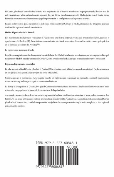 El Corán, glorificado como la obra literaria más importante de la historia musulmana, ha proporcionado durante más de mil cuatrocientos años un fundamento supremo de guía divina para los creyentes. El Hadiz, junto con el Corán como fuente de conocimiento, desempeña un papel importante en la configuración de la práctica islámica. En esta esclarecedora guía, exploramos la elaborada relación entre el Corán y el Hadiz, abordando las preguntas que han confundido a generaciones de musulmanes. Hadiz: El portador de la Sunnah Los musulmanes tradicionales consideran el Hadiz como una fuente histórica precisa que preserva los dichos, acciones y aprobaciones del Profeta (¿). Estos informes, transmitidos a través de una cadena de narradores, ofrecen una guía práctica en la forma de la Sunnah del Profeta (¿). La controversia que rodea al hadiz Las diferentes opiniones sobre la necesidad y confiabilidad del Hadith han llevado a confusión entre los creyentes. ¿Por qué necesitamos Hadith cuando tenemos el Corán? ¿Cómo conciliamos los hadices que contradicen los versos coránicos? Explorando preguntas esenciales Revelación más allá del Corán: ¿Recibió el Profeta (¿) revelaciones más allá de los versículos coránicos? Exploramos casos en los que el Corán y los hadices arrojan luz sobre este asunto. Contradicciones y explicación: ¿Qué sucede cuando un hadiz parece contradecir un versículo coránico? Examinamos textos coránicos y hadices para explicar estas contradicciones. La Torá y el Evangelio en el Corán: ¿Por qué el Corán menciona escrituras anteriores? Exploramos la importancia de estas referencias y su papel en el refuerzo de la continuidad de la guía divina. A través de citas meticulosas de versos coránicos y textos de hadices, este libro busca iluminar el intercambio entre estas dos fuentes. Ya sea usted un buscador curioso, un musulmán o un revertido, "Guía divina: Descubriendo la sabiduría del Corán y los hadices" proporciona claridad, comprensión, arroja luz sobre conceptos erróneos y lo invita a explorar el rico tapiz del conocimiento islámico.