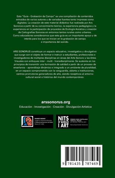 Esta "Guía - Grabación de Campo" es una compilación de contenidos extraídos de varios autores y de variadas fuentes tanto impresas como digitales. La creación de este material didáctico fue realizada por Ars Sonorus a partir de su conocimiento teórico, la experiencia pedagógica y la experiencia en la participación de proyectos de Ecología Acústica y creación de Cartografías Sonoras en entornos tantos rurales como urbanos. Como educadores consideramos que esta guía es un importante apoyo y de interés para los que se inician en la grabación de campo e importancia del sonido.