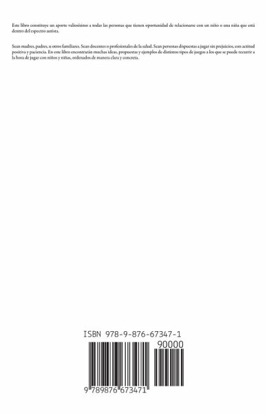 Este libro constituye un aporte valiosísimo a todas las personas que tienen oportunidad de relacionarse con un niño o una niña que está dentro del espectro autista. Sean madres, padres, u otros familiares. Sean docentes o profesionales de la salud. Sean personas dispuestas a jugar sin prejuicios, con actitud positiva y paciencia. En este libro encontrarán muchas ideas, propuestas y ejemplos de distintos tipos de juegos a los que se puede recurrir a la hora de jugar con niños y niñas, ordenados de manera clara y concreta. EDITORIAL BONUM ARGENTINA Este libro contiene el desarrollo de los siguientes temas, entre otros:El rol de las personas adultas como mediadoras y facilitadoras Tipos de participación de los niños y las niñas Juego con burbujas Juegos de transición hacia una participación activa Juegos interactivos Juegos de construcción Juegos funcionales y simbólicos Con este libro usted podrá conocer herramientas de juego dirigidas para infantes autistas.