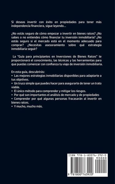 Si deseas invertir con éxito en propiedades para tener más independencia financiera, sigue leyendo... ¿No estás seguro de cómo empezar a invertir en bienes raíces? ¿No sabes o no entiendes cómo financiar tu inversión inmobiliaria? ¿No estás seguro si el mercado está en el momento adecuado para comprar? ¿Necesitas asesoramiento sobre qué estrategia inmobiliaria seguir? La "Guía para principiantes en Inversiones de Bienes Raíces" te proporcionará el conocimiento, las técnicas y las herramientas para que puedas comenzar con confianza tu viaje de inversión inmobiliaria. En esta guía, descubrirás:Las mejores estrategias inmobiliarias disponibles para adaptarte a tus objetivos. Un truco simple que puedes hacer para asegurarte de tener un trato viable. El único método para comprender y mitigar los riesgos. Por qué son importantes el análisis de mercado y de propiedades Comprender por qué algunas personas fracasarán al invertir en bienes raíces. Y mucho, mucho más. Los métodos y los conocimientos probados son muy fáciles de seguir. Incluso si eres un principiante en la inversión inmobiliaria, podrás alcanzar un alto nivel de éxito. Si desea crear riqueza, seguridad y libertad financiera a través de la inversión inmobiliaria, ¡comience a leer este libro hoy!
