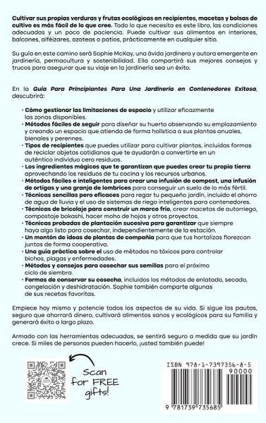 Cultivar sus propias verduras y frutas ecológicas en recipientes, macetas y bolsas de cultivo es más fácil de lo que cree. Todo lo que necesita es este libro, las condiciones adecuadas y un poco de paciencia. Puede cultivar sus alimentos en interiores, balcones, alféizares, azoteas o patios, prácticamente en cualquier sitio. Su guía en este camino será Sophie McKay, una ávida jardinera y autora emergente en jardinería, permacultura y sostenibilidad. Ella compartirá sus mejores consejos y trucos para asegurar que su viaje en la jardinería sea un éxito. En la Guía Para Principiantes Para Una Jardinería en Contenedores Exitosa, descubrirá:Cómo gestionar las limitaciones de espacio y utilizar eficazmente las zonas disponibles. Métodos fáciles de seguir para diseñar su huerto observando su emplazamiento y creando un espacio que atienda de forma holística a sus plantas anuales, bienales y perennes. Tipos de recipientes que puede utilizar para cultivar plantas, incluidas formas de reciclar objetos cotidianos que le ayudarán a convertirle en un auténtico individuo cero residuos. Los ingredientes mágicos que le garantizan que puede crear su propia tierra aprovechando los residuos de su cocina y los recursos urbanos. Métodos fáciles e inteligentes para crear una infusión de compost, una infusión de ortigas y una granja de lombrices para conseguir un suelo de lo más fértil. Técnicas sencillas pero eficaces para regar su pequeño jardín, incluido el ahorro de agua de lluvia y el uso de sistemas de riego inteligentes para contenedores. Técnicas de bricolaje para construir un marco frío, crear macetas de autorriego, compostaje bokashi, hacer moho de hojas y otros proyectos. Técnicas probadas de plantación sucesiva para garantizar que siempre haya algo listo para cosechar, independientemente de la estación. Un montón de ideas de plantas de compañía para que sus hortalizas florezcan juntas de forma cooperativa. Una guía práctica sobre el uso de métodos no tóxicos para controlar bichos, plagas y enfermedades. Métodos y consejos para cosechar sus semillas para el próximo ciclo de siembra. Formas de conservar su cosecha, incluidos los métodos de enlatado, secado, congelación y deshidratación. Sophie también comparte algunas de sus recetas favoritas. Empiece hoy mismo y potencie todos los aspectos de su vida. Si sigue las pautas, seguro que ahorrará dinero, cultivará alimentos sanos y ecológicos para su familia y generará éxito a largo plazo. Armado con las herramientas adecuadas, se sentirá seguro a medida que su jardín crece. Si miles de personas pueden hacerlo, ¡usted también puede!