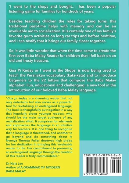 'I went to the shops and bought...' has been a popular listening game for families for hundreds of years. Besides teaching children the rules for taking turns, this traditional past-time helps with memory and can be an invaluable aid to socialization. It is certainly one of my family's favorite go-to activities on long car trips and before bedtime, and I can testify that it brings our family closer together. So, it was little wonder that when the time came to create the first ever Baba Malay Reader that I fell back on an old and trusty treasure. Gua Pi Keday or I went to the Shops, is now being used to teach the Peranakan vocabulary (kata-kata) and to introduce beginners to the 22 letters that compose the Baba Malay alphabet. Fun, educational and challenging: a new tool in the introduction of our beloved Baba Malay language. The first book in the series New Peranakan Tales created to complement the Baba Malay Today series.