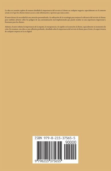 La obra en cuestión explora de manera detallada la importancia del servicio al cliente en cualquier negocio, especialmente en el contexto actual, en el que los clientes tienen acceso a más información y opciones que nunca antes. El autor destaca la necesidad de una atención personalizada y la utilización de la tecnología para mejorar la eficiencia del servicio al cliente, pero también advierte sobre los peligros de una automatización mal implementada que puede resultar en una experiencia impersonal y frustrante para los clientes. Además, el autor enfatiza la importancia de la empatía, la transparencia y la rapidez en la atención al cliente, especialmente en momentos de crisis. En resumen, esta obra es una reflexión profunda y detallada sobre la importancia del servicio al cliente para el éxito y la supervivencia de cualquier empresa en la era digital.