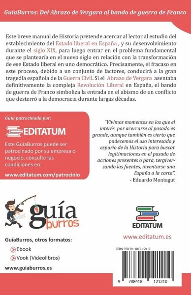 Sinopsis Este breve manual de Historia pretende acercar al lector al estudio del establecimiento del Estado liberal en España, y su desenvolvimiento durante el siglo XIX, para luego entrar en el problema fundamental que se plantearía en el nuevo siglo en relación con la transformación de ese Estado liberal en uno democrático. Precisamente, el fracaso en este proceso, debido a un conjunto de factores, conducirá a la gran tragedia española de la Guerra Civil. Si el Abrazo de Vergara asentaba definitivamente la compleja Revolución Liberal en España, el bando de guerra de Franco simboliza la entrada en el abismo de un conflicto que desterró a la democracia durante largas décadas. Sobre el autor Eduardo Montagut nació en Madrid en 1965, licenciándose en Historia Moderna y Contemporánea por la UAM en el año 1988, con premio extraordinario. En la misma Universidad alcanzaría el doctorado en 1996 con una tesis sobre los alguaciles de Casa y Corte en el Madrid del Antiguo Régimen, un estudio social del poder. Por otro lado, el autor emprende estudios de la época ilustrada a través de la Real Sociedad Económica Matritense y la Real Sociedad Bascongada de Amigos del País sobre cuestiones de enseñanza, agricultura, montes y plantíos. En 1996 comienza su carrera de docente en Educación Secundaria en la Comunidad de Madrid.Con el nuevo siglo, Eduardo Montagut inicia una intensa actividad en medios digitales y escritos con publicaciones de divulgación e investigación histórica, política y de memoria histórica, así como impartiendo conferencias, y participando en charlas y debates. Sobre GuíaBurros Los GuíaBurros son manuales básicos para aprender a utilizar una herramienta, realizar una actividad o adquirir un conocimiento determinado de manera sencilla y fácil. Ocho colecciones * Empresa y Negocio * Desarrollo Personal * Ciencia y Tecnología * Hogar y Familia * Conocimiento y Saber * Salud y Belleza * Ocio y Tiempo libre * Deporte y Actividad física Club GuíaBurros Participa en el club GuíaBurros para estar informado de las últimas novedades editoriales y disfrutar de las promociones y condiciones especiales de los socios. guiaburros.es