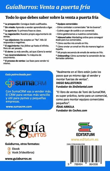GuíaBurros Venta a puerta fría es una guía con TODO lo que debes saber sobre la venta en frío, desde una correcta prospección, pasando por la resolución de objeciones, hasta el cierre de la venta. Toda la información en una guía sencilla y muy fácil de leer. La prospección: Consigue leads cualificados. Sin miedo: Aprende a vender aprendiendo a ligar. La apertura: Tu primera frase es clave. La negociación: Nuestro propio argumentario de ventas. Las objeciones: No aceptes un ?No?. Mis 10 respuestas a negativas. El seguimiento: Haz follow up hasta el infinito. Pero sin ser pesado. El cierre: Lo más sencillo, así que ¡Cierra la venta! Las recomendaciones: Tu máquina de crecimiento. El proceso de ventas: Las fases para vender tú mismo. Equipos comerciales: - Cómo contratar a comerciales "de los buenos?. - Cuánto pagar de sueldo a un comercial. - Cómo gestionamos a nuestros comerciales. Inbound sales: Marketing online para conseguir leads para tus comerciales. Cómo escribo mis emails en frío. Cómo enviar un email en frío de manera legal en España. Mi propia secuencia de emails de ventas en frío. Onboarding: Cómo aumentar la conversión de las llamadas calientes.