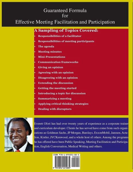 In the current globalized world, more and more non-native speakers of English are finding themselves in meetings with speakers of English from around the world. How does one function in such an environment when one is unsure of how to express opinions, express disagreement, or make one's point forcefully. Guaranteed Formula for Effective Meeting Facilitation and Participation provides the solution to this problem. Whether you find yourself in the leader's role or as a participant, there is ample information for you to build your skills to the level of proficiency necessary to be comfortable in any business communications setting.