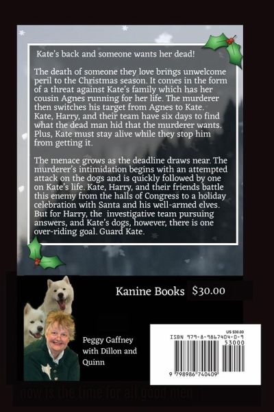 Kate's back, and someone wants her dead! The death of someone they love brings unwelcome peril to the Christmas season. It comes as a threat against Kate's family, which has her cousin Agnes running for her life. The murderer then switches his target from Agnes to Kate. Kate, Harry, and their team have six days to find what the dead man hid that the murderer wants. Plus, Kate must stay alive while they stop him from getting it. The menace grows as the deadline draws near. The murderer's intimidation begins with an attempted attack on the dogs followed by one on Kate's life. Kate, Harry, and their friends battle this enemy from the halls of Congress to a holiday celebration with Santa and his well-armed elves. But for Harry, the investigative team pursuing answers, and Kate's dogs, however, there is one overriding goal. Guard Kate.