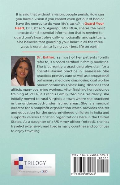 It is said that without a vision, people perish. How can you have a vision if you cannot even get out of bed or have the energy to do your life's tasks? In Guard Your Heart, Dr. Esther S. Ajjarapu, MD, MBA, shares the most practical and essential information that is needed to guard one's heart physically, emotionally, and spiritually. She believes that guarding your heart in all the three ways is essential to living your best life on earth.