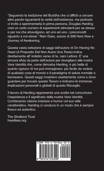 Seguendo la tradizione del Buddha che ci diffidò a cercare altre parole riguardanti la verità dell'esistenza, ma piuttosto ci invitò a sperimentarla in prima persona, Douglas Harding creò un certo numero di esperimenti stimolanti per se stesso e per noi, ad uno ad uno, stravolgono i preconcetti riguardo a noi stessi." Ram Dass, autore di Still Here Now e Journey of Awakening. Questa vasta selezione di saggi dell'autore o di On Having No Head (A Proposito Del Non Avere Una Testa) indica direttamente all' indietro verso di te, caro Lettore. E' una sincera sfida da parte dell'autore per risvegliarci alla nostra Vera Identità che, come dimostra Harding è più bella di quanto ognuno di noi può immaginare, più facile da vedere di qualsiasi cosa al mondo e il paradigma di salute mentale e benessere. Questi saggi vi mostrano esattamente come e dove guardare per trovare questo Tesoro e indicano le immense implicazioni personali e globali di questo Risveglio. Il lavoro di Harding rappresenta una svolta nel comunicare l'esperienza e il significato della nostra Vera Identità. Combinando visione interiore e humor col suo stile caratteristico, Harding ci conduce in un modo che è sempre fresco ed autentico.