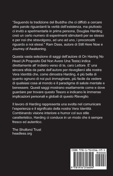 Seguendo la tradizione del Buddha che ci diffidò a cercare altre parole riguardanti la verità dell'esistenza, ma piuttosto ci invitò a sperimentarla in prima persona, Douglas Harding creò un certo numero di esperimenti stimolanti per se stesso e per noi, ad uno ad uno, stravolgono i preconcetti riguardo a noi stessi." Ram Dass, autore di Still Here Now e Journey of Awakening. Questa vasta selezione di saggi dell'autore o di On Having No Head (A Proposito Del Non Avere Una Testa) indica direttamente all' indietro verso di te, caro Lettore. E' una sincera sfida da parte dell'autore per risvegliarci alla nostra Vera Identità che, come dimostra Harding è più bella di quanto ognuno di noi può immaginare, più facile da vedere di qualsiasi cosa al mondo e il paradigma di salute mentale e benessere. Questi saggi vi mostrano esattamente come e dove guardare per trovare questo Tesoro e indicano le immense implicazioni personali e globali di questo Risveglio. Il lavoro di Harding rappresenta una svolta nel comunicare l'esperienza e il significato della nostra Vera Identità. Combinando visione interiore e humor col suo stile caratteristico, Harding ci conduce in un modo che è sempre fresco ed autentico.