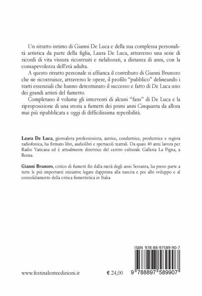 Un ritratto intimo di Gianni De Luca e della sua complessa personalità artistica da parte della figlia, Laura De Luca, attraverso una serie di ricordi di vita vissuta ricostruiti e rielaborati, a distanza di anni, con la consapevolezza dell'età adulta. A questo ritratto personale si affianca il contributo di Gianni Brunoro che ne ricostruisce, attraverso le opere, il profilo "pubblico" delineando i tratti essenziali che hanno determinato il successo e fatto di De Luca uno dei grandi artisti del fumetto. Completano il volume gli interventi di alcuni "fans" di De Luca e la riproposizione di una storia a fumetti dei primi anni Cinquanta da allora mai più ripubblicata e oggi di difficilissima reperibilità.