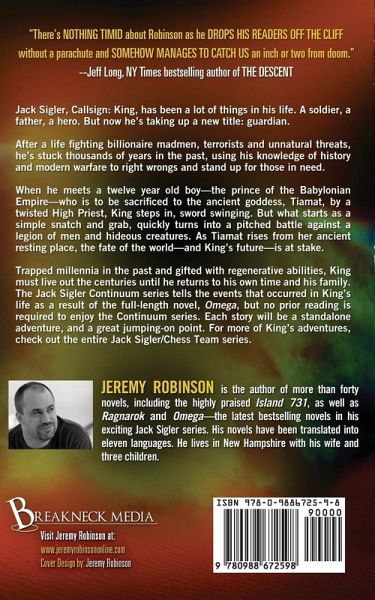 Jack Sigler, Callsign: King, has been a lot of things in his life. A soldier, a father, a hero. But now he's taking up a new title: guardian. After a life fighting billionaire madmen, terrorists and unnatural threats, he's stuck thousands of years in the past, using his knowledge of history and modern warfare to right wrongs and stand up for those in need. When he meets a twelve year old boy-the prince of the Babylonian Empire-who is to be sacrificed to the ancient goddess, Tiamat, by a twisted High Priest, King steps in, sword swinging. But what starts as a simple snatch and grab, quickly turns into a pitched battle against a legion of men and hideous creatures. As Tiamat rises from her ancient resting place, the fate of the world-and King's future-is at stake. Trapped millennia in the past and gifted with regenerative abilities, King must live out the centuries until he returns to his own time and his family. The Jack Sigler Continuum series tells the events that occurred in King's life as a result of the full-length novel, Omega, but no prior reading is required to enjoy the Continuum series. Each story will be a standalone adventure, and a great jumping-on point. For more of King's adventures, check out the entire Jack Sigler/Chess Team series.