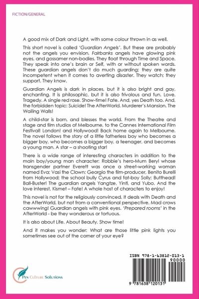 good mix of Dark and Light, with some colour thrown in as well. This short novel is called 'Guardian Angels'. But these are probably not the angels you envision. Fairbanks angels have glowing pink eyes, and gossamer non-bodies. They float through Time and Space. They speak into one's brain or Self, with or without spoken words. These guardian angels don't do much guarding; they are quite incompetent when it comes to averting disaster. They watch; they support. They know. Guardian Angels is dark in places, but is also bright and gay, enchanting. It is philosophic, but it is also frivolous and fun. Love. Tragedy. A single red rose. Show-time! Fate. And yes, Death too. And, the forbidden topic: Suicide! The Afterworld. Murderer's Mansion. The Wailing Walls! A child-star is born, and blesses the world. From the Theatre and stage and film studios of Melbourne, to the Cannes International Film Festival! London! and Hollywood! Back home again to Melbourne. The novel follows the story of a little fatherless boy who becomes a bigger boy, who becomes a bigger boy, a teenager, and becomes a young man. A star - a shooting star! There is a wide range of interesting characters in addition to the main boy/young man character: Robbie's hero-Mum Beryl whose transgender partner Everett was once a street-working woman named Eva; Vasi the Clown; Georgio the film-producer, Benito Burelli from Hollywood; the school bully Cyrus and fat-boy Solly; Butthead! Ball-Buster! The guardian angels Yangtze, Yintl, and Yubo. And the love interest, Kismet-Fate! A whole host of characters to enjoy! This novel is not for the religiously convinced. It deals with Death and the AfterWorld, but not from a conventional perspective. Mad crows cawwwing! Guardian angels with pink eyes. 'Prepared rooms' in the AfterWorld- be they wonderous or tortuous. It is also about Life. About Beauty. Show time! And it makes you wonder: What are those little pink lights you sometimes see out of the corner of your eye?