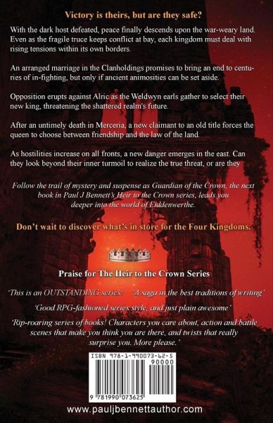 Victory is theirs, but are they safe? With the dark host defeated, peace finally descends upon the war-weary land. Even as the fragile truce keeps conflict at bay, each kingdom must deal with rising tensions within its own borders. An arranged marriage in the Clanholdings promises to bring an end to centuries of in-fighting, but only if ancient animosities can be set aside. Opposition erupts against Alric as the Weldwyn earls gather to select their new king, threatening the shattered realm's future. After an untimely death in Merceria, a new claimant to an old title forces the queen to choose between friendship and the law of the land. As hostilities increase on all fronts, a new danger emerges in the east. Can they look beyond their inner turmoil to realize the true threat, or are they sowing the seeds of their own destruction? Follow the trail of mystery and suspense as Guardian of the Crown, the next book in Paul J Bennett's Heir to the Crown series, leads you deeper into the world of Eiddenwerthe. Don't wait another day to discover what's in store for the Four Kingdoms. New to the series? Meet Gerald Matheson, the steadfast warrior in Servant of the Crown, Heir to the Crown: Book One, available in eBook, Audiobook, and Paperback.