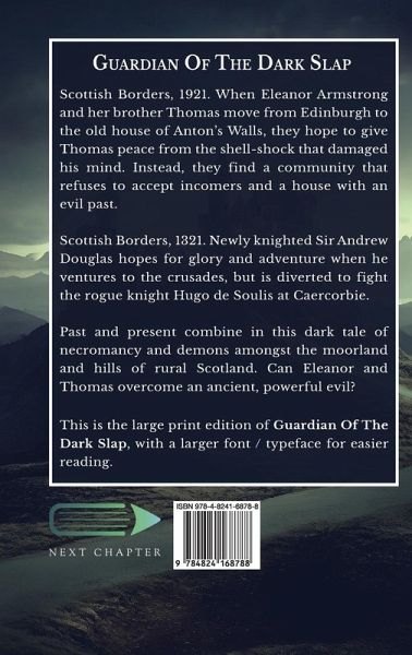 Scottish Borders, 1921. When Eleanor Armstrong and her brother Thomas move from Edinburgh to the old house of Anton's Walls, they hope to give Thomas peace from the shell-shock that damaged his mind. Instead, they find a community that refuses to accept incomers and a house with an evil past. Scottish Borders, 1321. Newly knighted Sir Andrew Douglas hopes for glory and adventure when he ventures to the crusades, but is diverted to fight the rogue knight Hugo de Soulis at Caercorbie. Past and present combine in this dark tale of necromancy and demons amongst the moorland and hills of rural Scotland. Can Eleanor and Thomas overcome an ancient, powerful evil? This is the large print edition of Guardian Of The Dark Slap, with a larger font / typeface for easier reading.