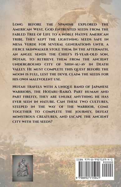 Long before the Spanish explored the American West, the Creator entrusted seeds from the fabled Tree of Life to a noble Native American tribe. They kept the lightning seeds safe in Mesa Verde for several generations until a fierce skinwalker stole them. In the aftermath, an angel sends the Chief's 15-year-old son, Notah, to retrieve them from the ancient underground city of Shin-au-av in Death Valley. He must complete this quest before the moon is full, lest the devil claim the seeds for his own malevolent use. Notah travels with a unique band of Japanese warriors, the Hotaru-Raik¿. Part human and part firefly, they are unlike anything he has ever seen in nature. Can these two cultures, steeped in the way of the warrior, come together to complete the journey, defeat monstrous creatures, and escape the ancient city with the seeds?